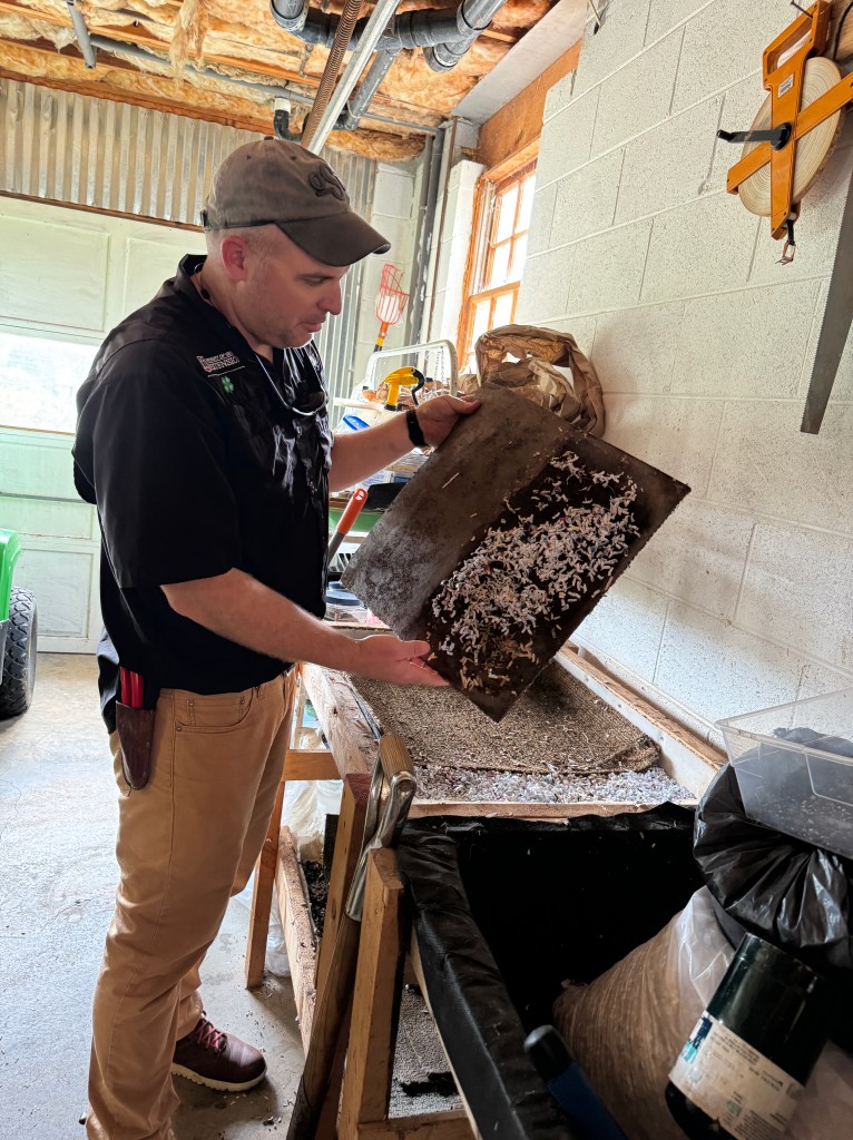 B) Pick out larger pieces and worms by hand. Lay out a tarp and scoop the dry upper layers from your compost bin onto it. Pick through the pile, taking out the worms and material that hasn’t broken down. All of that can go back into your compost bin on top of the moist bed of compost. Make sure your worms don’t sit out in the open for too long, or they will dry out!